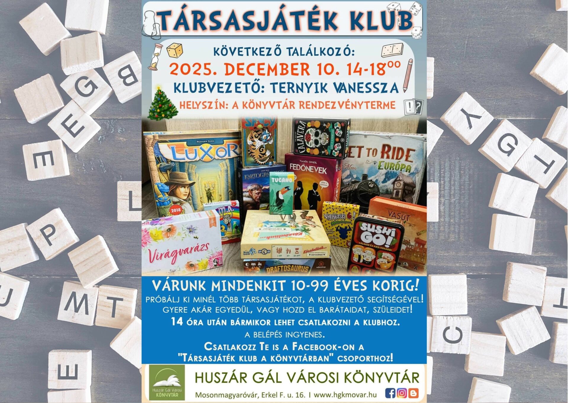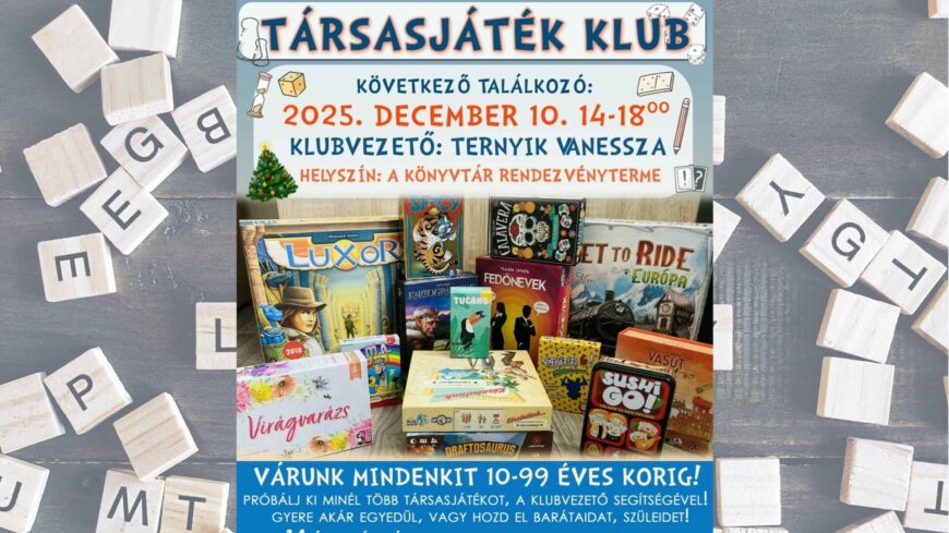 A könyvtár szeretettel hív mindenkit, aki egy kis közös játékkal zárná az évet. További információ és közösségi kapcsolattartás a Facebookon található „Társasjáték klub a könyvtárban” csoportban érhető el.