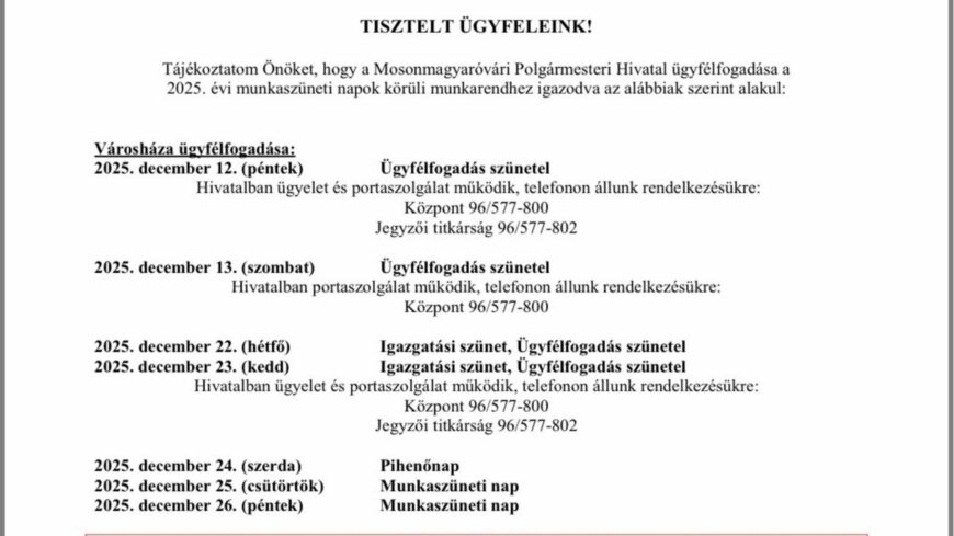 A Mosonmagyaróvári Polgármesteri Hivatal ügyfélfogadása az ünnepek körüli időszakban az alábbiak szerint alakul: